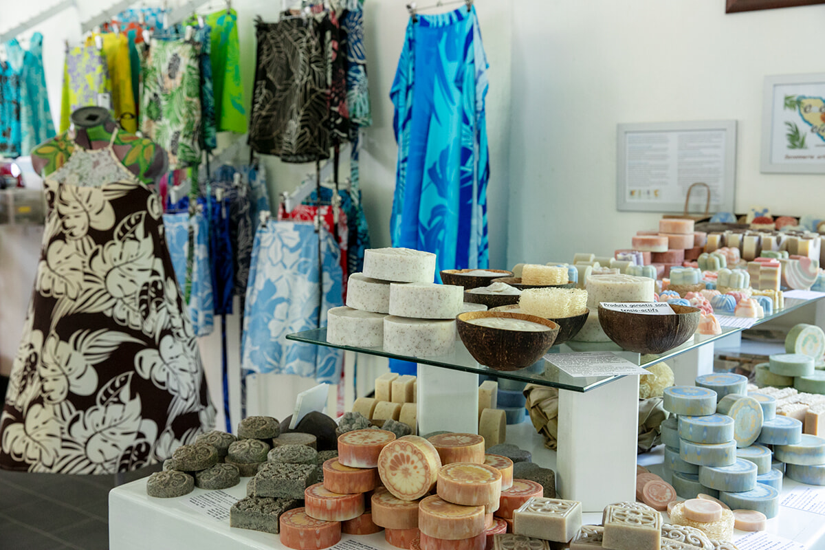 ポリネシア固有種の栽培や品種改良などに取り組む農業高校では、学生が栽培する果物を加工し、販売。名産のパイナップルをはじめ、バナナやグアバなどをその場で搾るフレッシュジュースやアイスクリームを味わって。コンフィチュールや、しっとり感が絶品のドライフルーツはお土産に。