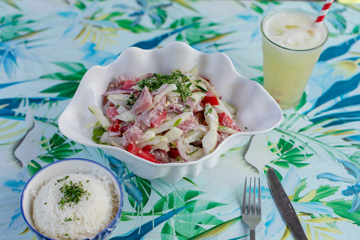 ご飯と一緒にいただく。「Poisson Cru au Lait Coco, Riz」2,200CFP、フレッシュジュース700CFP~。エビのクリュやエビカレーもぜひ。