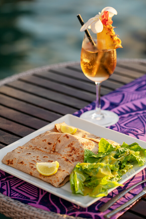 足元では珊瑚に魚が集まり、見上げれば満天の星。水上に立つタヒチでも珍しいクレープバーは、ロケーションも最高。ソバ粉のガレットは夕食になり、甘いクレープは食後のデザートに。ノルマンディ出身の初代クレープ職人のメニューも残る。人気はシーフードたっぷりのホワイトソースのガレット。本格的な料理のお供は、もちろんシードルで。
