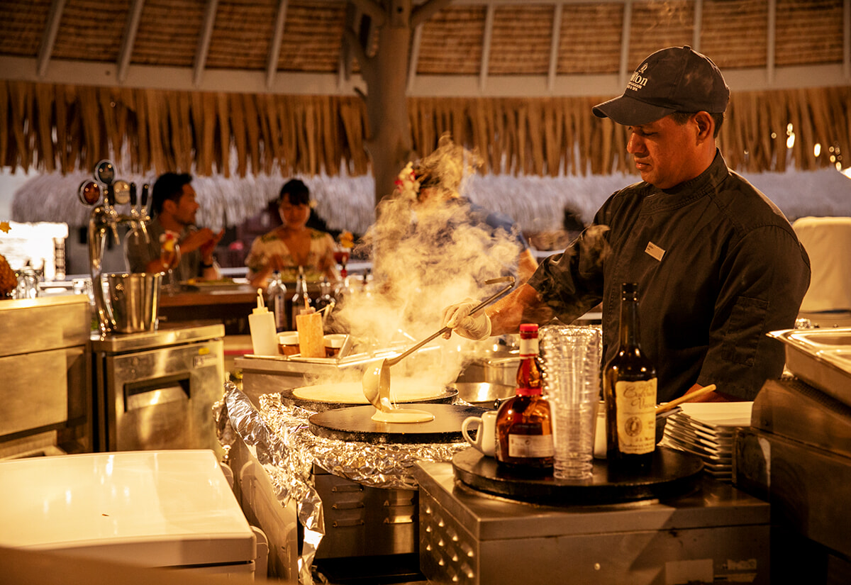 モーレア島唯一の5ツ星ホテルの水上で、夜だけオープン。中央円形のバーで焼き上げる。