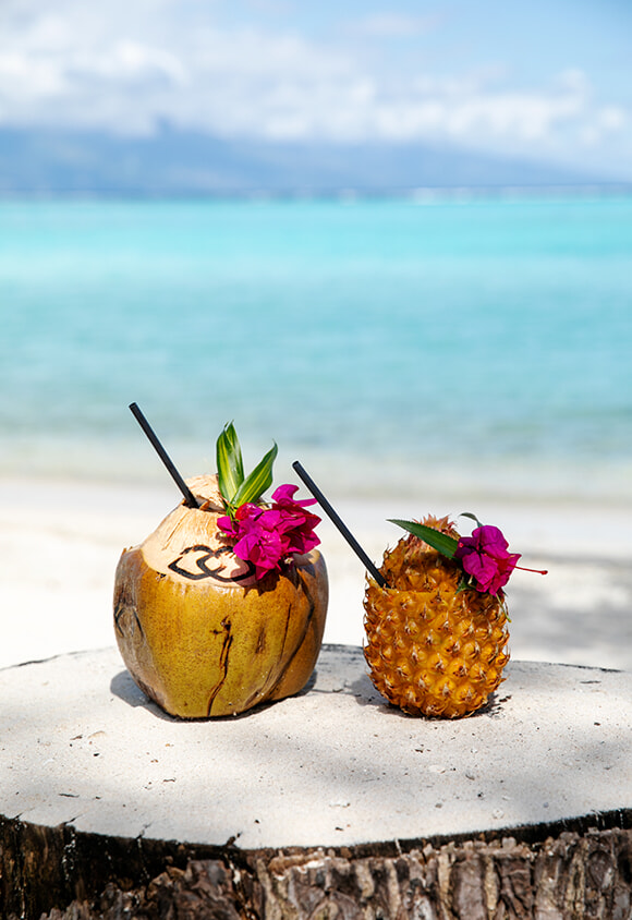 ビーチ・バーでは、マヌテアのラム、ロツイのジュースなどモーレア産の素材を使ったカクテルを。左から、「Coco Colada」「Pinapple Maitai」各3,040CFP