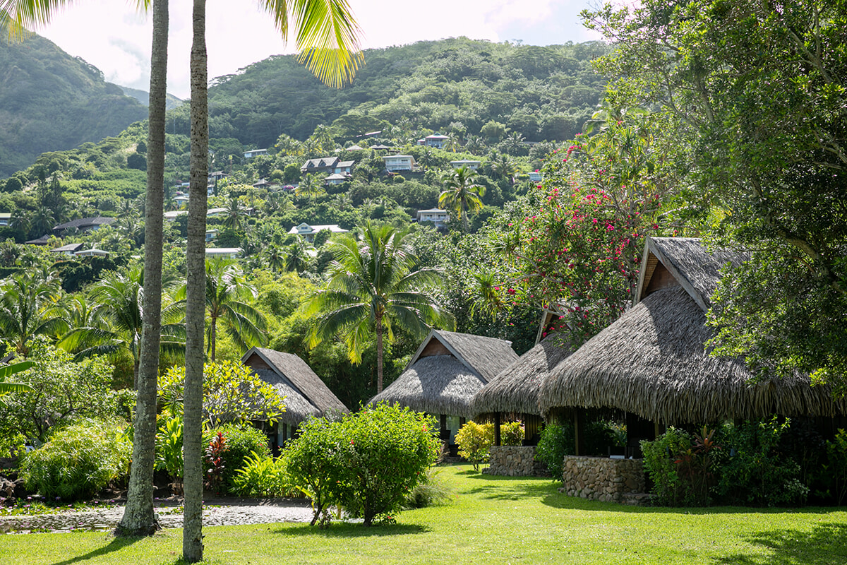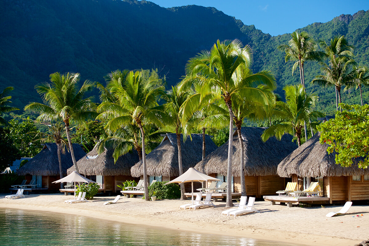 ヴァイアレ港から車で約20分、空港からは約10分という立地なので、山や海へとアクティブに過ごす拠点に。リゾート内は気取らない雰囲気が漂う。部屋は水上やビーチのバンガローのほかプール付きやホテルタイプなど幅広い。ビーチは広くはないが、海のアクティビティが充実している。今春、フロントエリアの改装が完了したばかり。