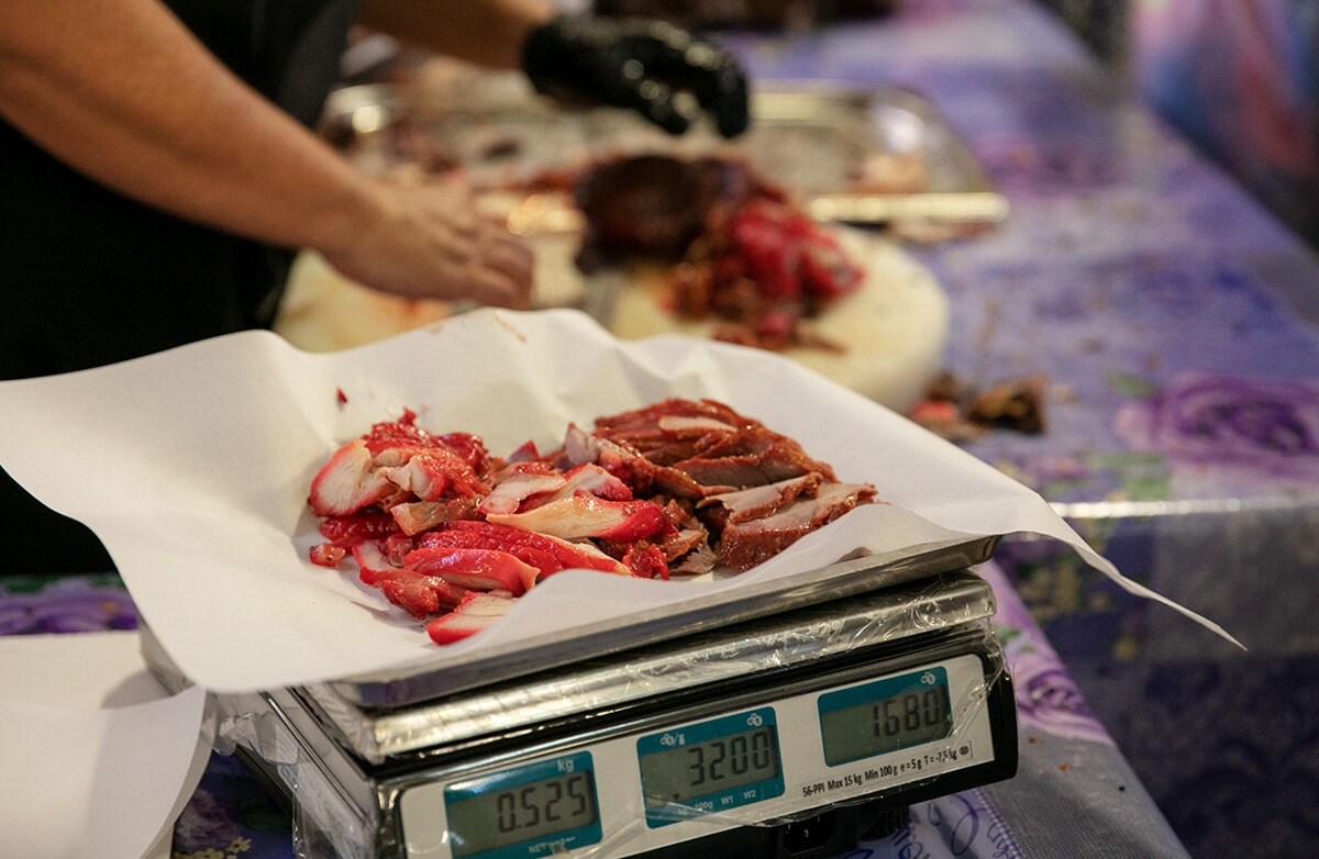 焼き豚の量り売りも日曜だけのお楽しみ。フランスパンに挟んで朝食に。