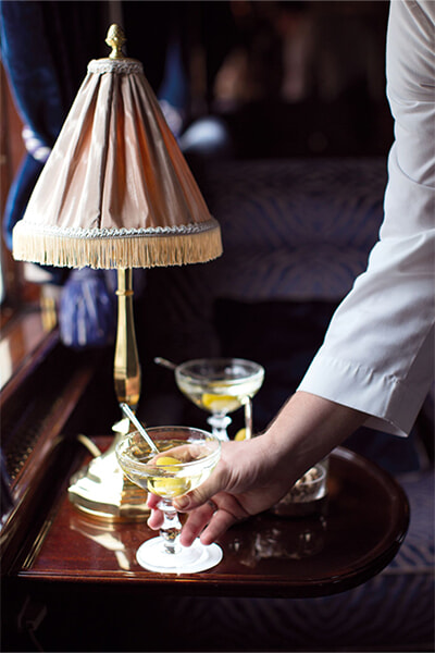食事は車中の大切なエンターテイメントのひとつ。寄木細工やガラス装飾が美しい歴史あるダイニングカーで、専属シェフ、ジーン・インバートが各地の旬の素材をフル活用した最高級の料理が味わえる。ソムリエが選んでくれるベストマッチのワインがその味をさらに引き立ててくれるはずだ。