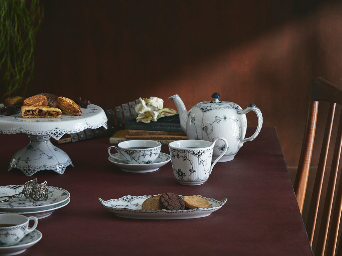 「ブラックフルーテッド ハーフレース」ケーキスタンド¥88,000、ティーカップ&ソーサー¥22,000、ハイハンドルマグ¥20,350、ティーポット¥55,000、ピックルディッシュ¥33,000/すべてロイヤル コペンハーゲン
