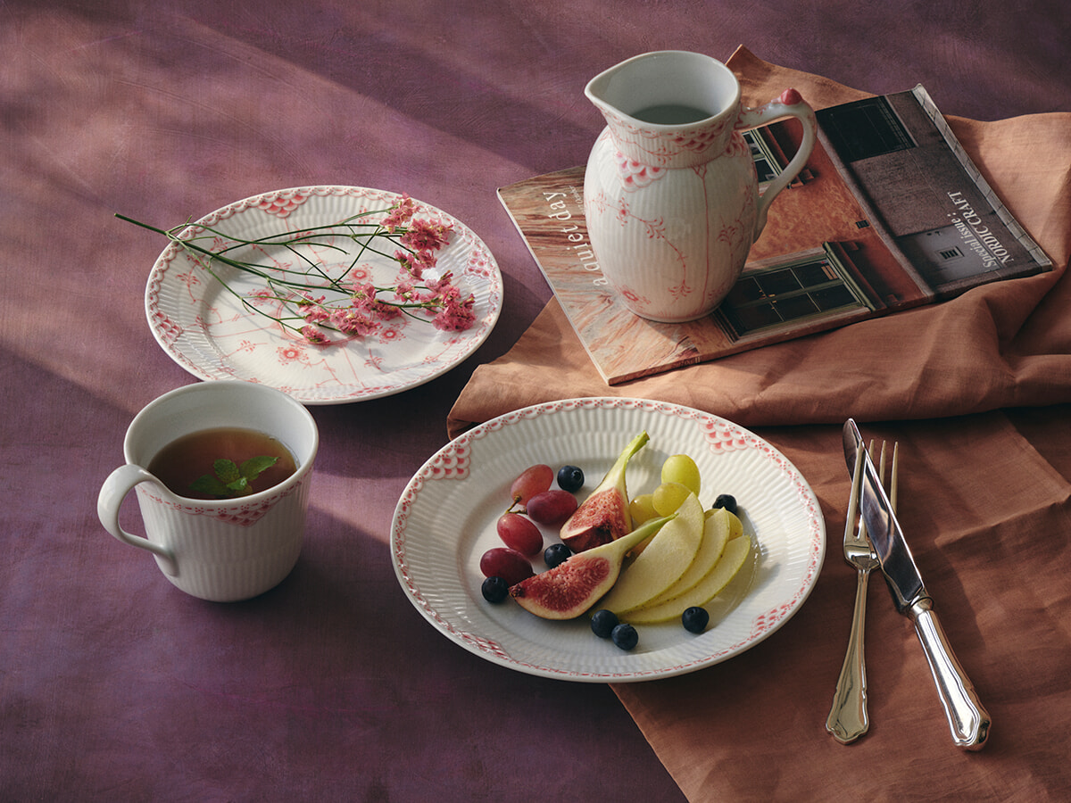 「コーラルフルーテッド ハーフレース」ジャグ¥26,400、プレート(∅19cm)¥22,000、「コーラル レース」ハイハンドルマグ¥14,300、プレート(∅22cm)¥12,100/すべてロイヤル コペンハーゲン
