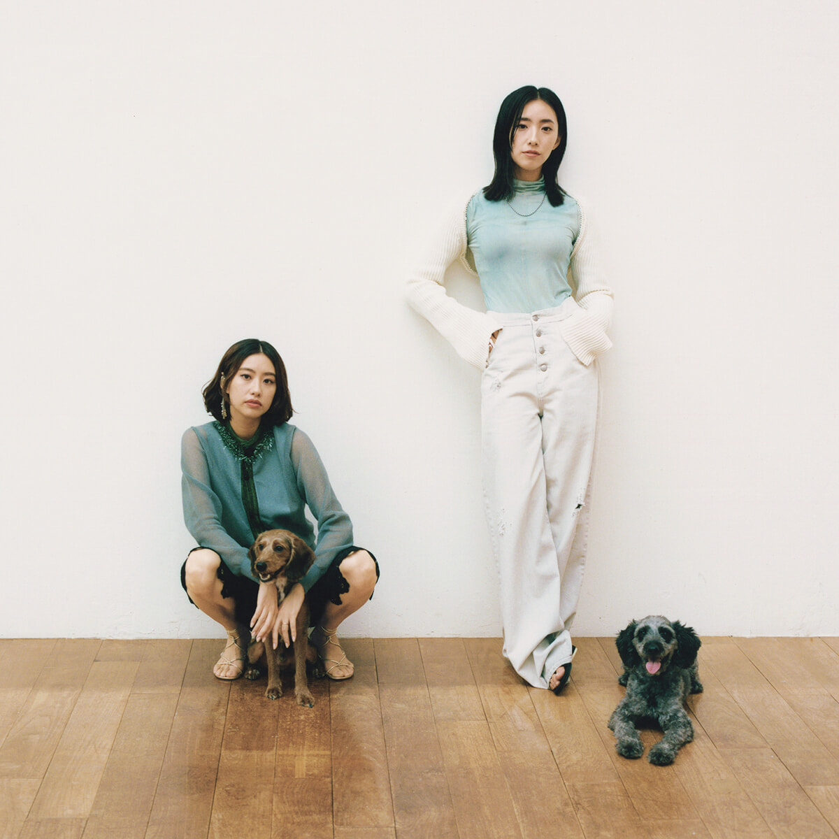 クルミ:ボディスーツ¥69,300、ニットボレロ¥57,200、デニムパンツ¥73,700、サンダル¥73,700/以上エムエム6 メゾン マルジェラ(マルジェラ ジャパン クライアントサービス) ネックレス/スタイリスト私物 みのり:カーディガン¥47,300、パンツ¥62,700/ともにトーガ プルラ、イヤカフ(2個セット)¥29,700/トーガ アーカイブス(以上トーガ 原宿店) サンダル¥81,400/フォルテ フォルテ(コロネット)