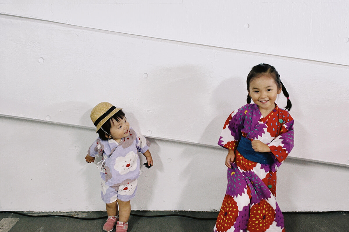 まずは衣装から! 次女はおさがりの甚平で、長女は今年新調した浴衣を着せて(ユカタビラという商品で、裾広がりのワンピースのようなデザイン。動きやすそうだった)