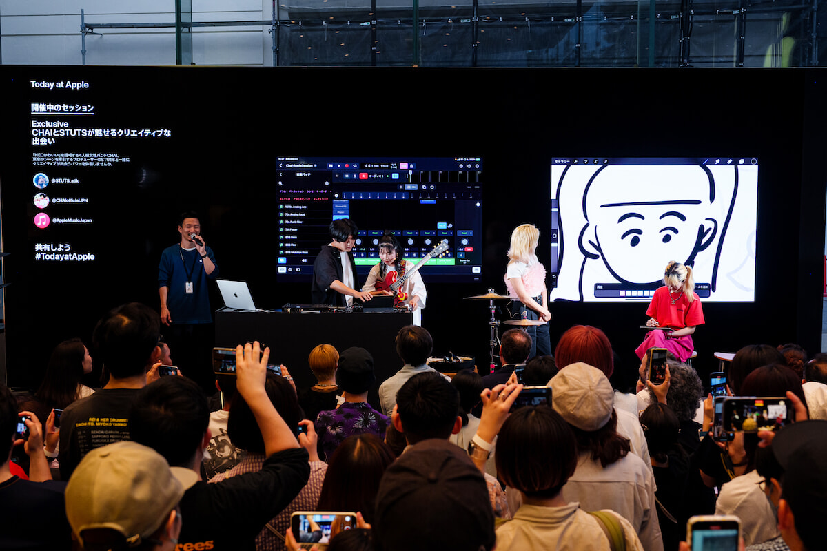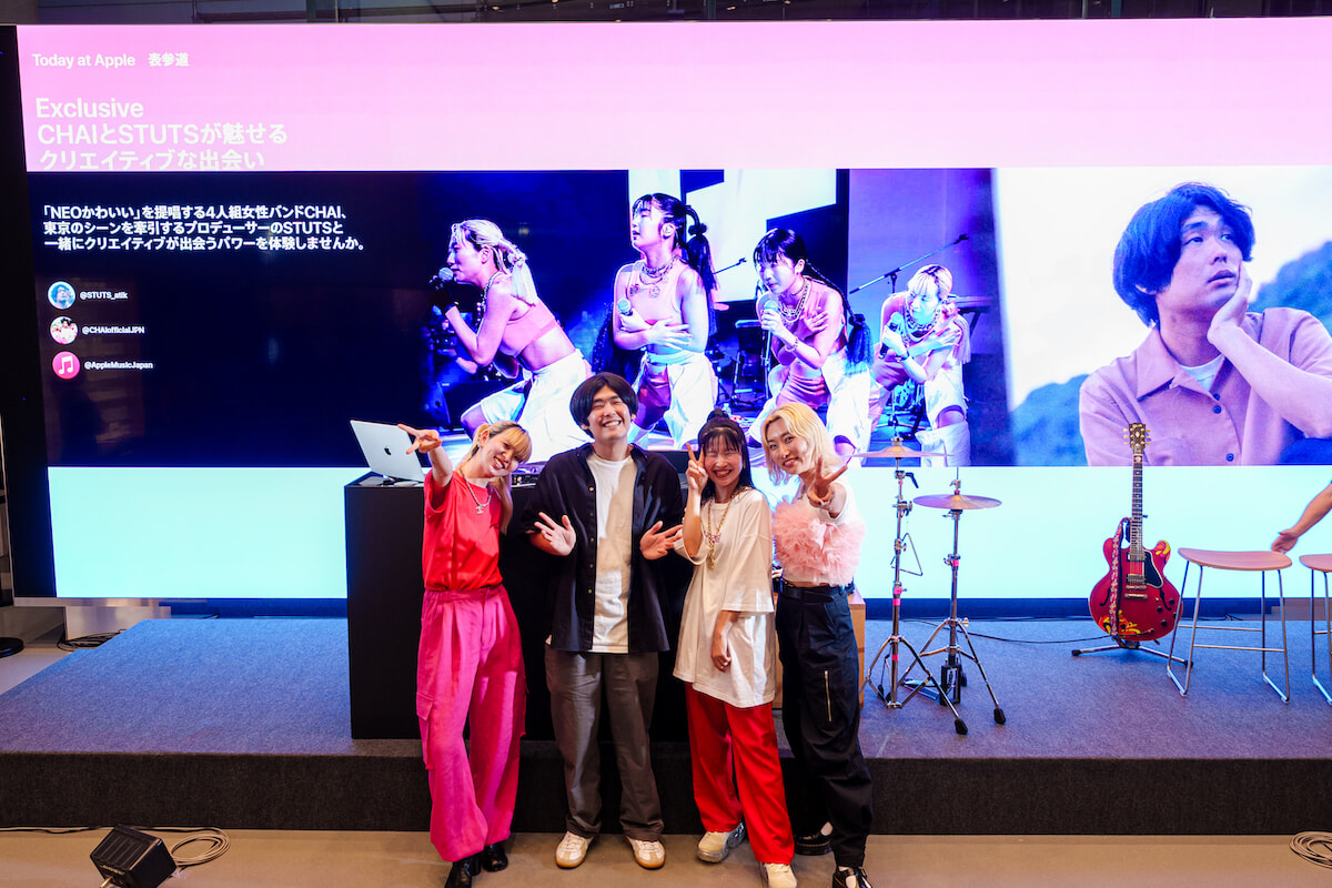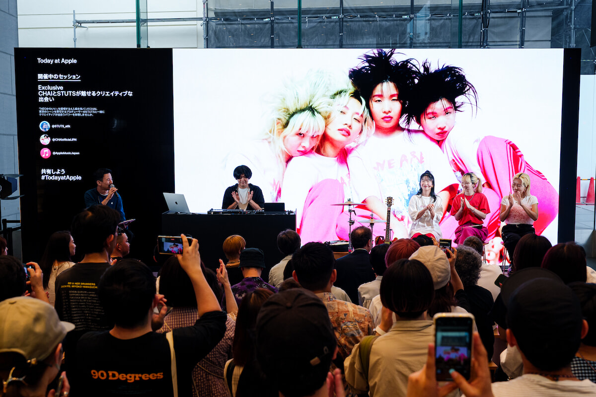 「Today at Apple」は、Apple製品やアプリの使い方を楽しく学べる無料参加型イベント。この日は、「NEOかわいい」「コンプレックスはアートなり」というコンセプトを掲げて活動するガールズバンドCHAIと、今を輝くトラックメイカーのSTUTSが参加。このCHAIとSTUTSのコンビは、6月1日に東京で開催された「CHANEL2022/23年メティエダール コレクション」に参加し話題になったことでも記憶に新しい。”クリエイティブな出会い”をテーマに、東京の音楽シーンを代表する2アーティストによる一夜限りのコラボレーションが叶った。