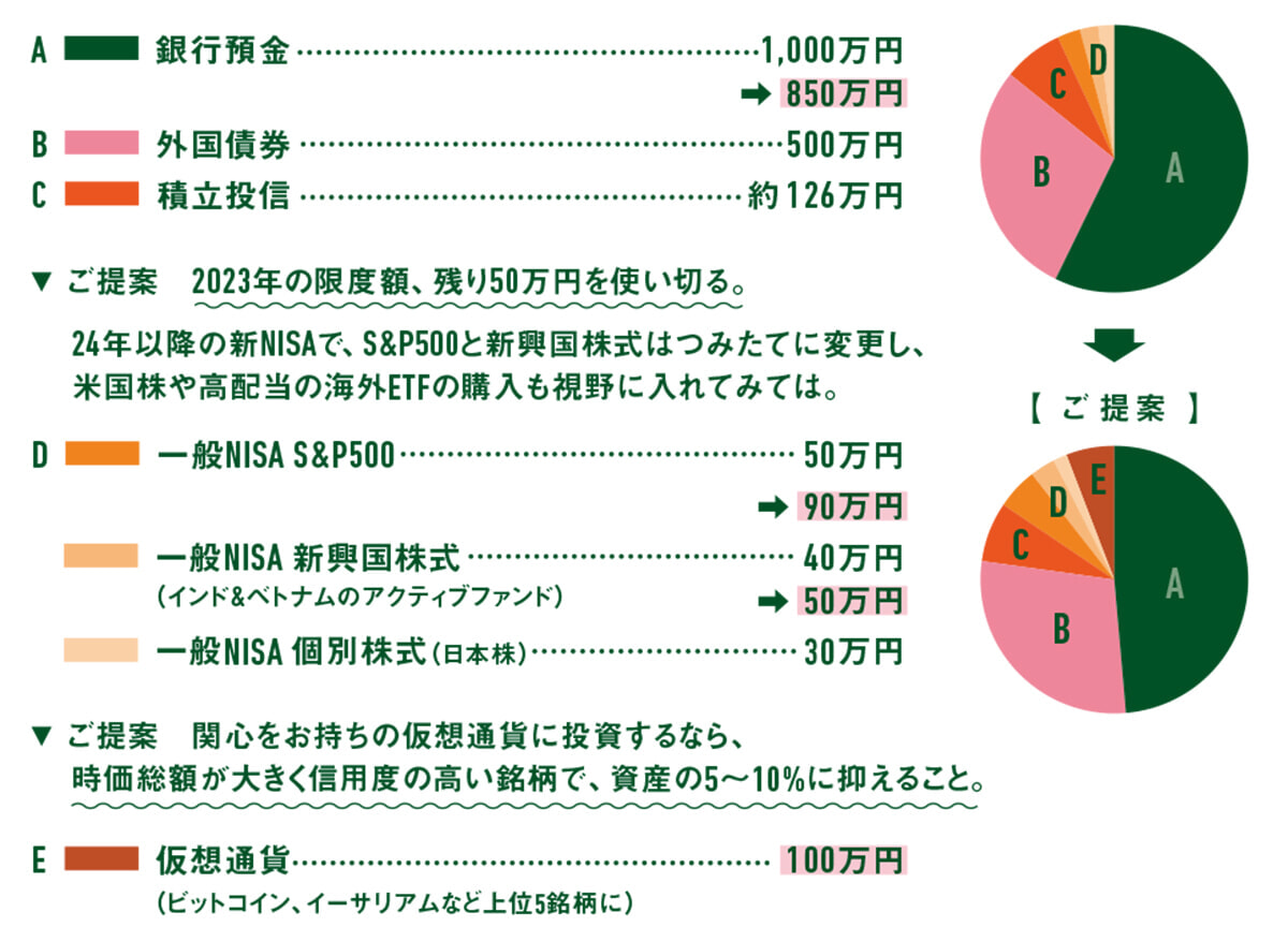 もうひとつは、今年中に一般NISAの非課税枠を満額(年間120万円)使い切ることと、来年から始まる新NISAで投資額を増やすこと。現在、一般NISAで「日本企業の個別株」「アメリカの代表的な株価指数S&P500に連動したファンド」「新興国のインデックスファンド」に投資されていますが、割合や掛け金を見直してみましょう。ご興味をお持ちの仮想通貨は、値動きが大きいためハイリスクな投資商品ではありますが、ビットコインやイーサリアムなど時価総額が大きく信用度の高い銘柄は、長期保有で値上がり益を得られる可能性が高いです。とはいえ、仮想通貨の市場は未成熟なので、総資産の1割未満で検討されると良いかもしれません。