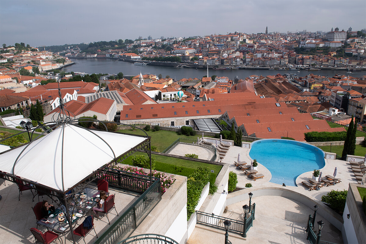 ホテルの広々とした屋外テラスからはポルトの街並みが一望できる。右手にはデカンタの形をした屋外インフィニティプール。©The Yeatman Hotel