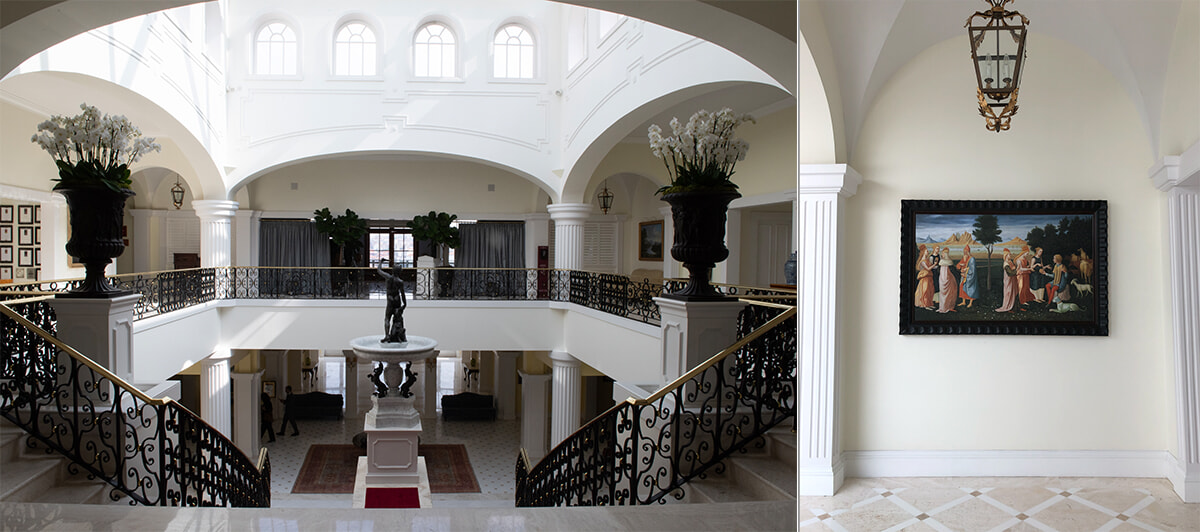 上左: エントランス正面に広がるホテルの中央部分。奥の扉から広々とした屋外テラスに出ることができる。photography: Ayumi Shino 上右: まるで美術館のような館内のあらゆる場所に、西洋絵画やアズレージョ(ポルトガルのタイル)を使った美術作品などが飾られていて、8つの常設展、壁に飾られるアート作品が特徴的。