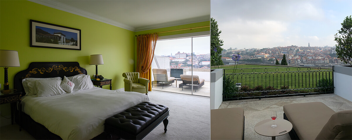 上左: エグゼクティブルーム。窓が広く、光がきれい。高級なエジプト綿のシーツはしなやかで、極上の寝心地を約束。photography: Ayumi Shino 上右: 広々としたテラスでは、ポルトの美しい街並みを独り占めできるのが最大の魅力。部屋に置かれているポートワインを片手に、のんびり過ごすのもおすすめ。