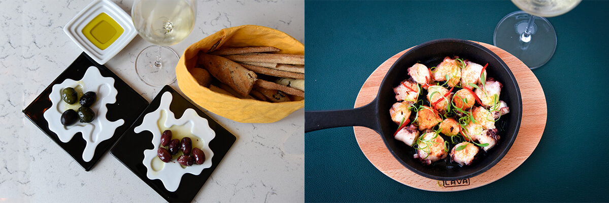 上左: こちらはカジュアルダイニング、ザ・オランジェリーでの夕食。「Olive」コース料理の前菜で出てくる塩味がきいた柔らかなオリーブの中にはバターが入っていて、口の中でなめらかにとろける。 上右: ポルトガル名物の蒸しタコのパプリカパウダー添え「Octopus」。弱火で長時間かけて蒸すことでしっとりした食感に。photography: Ayumi Shino