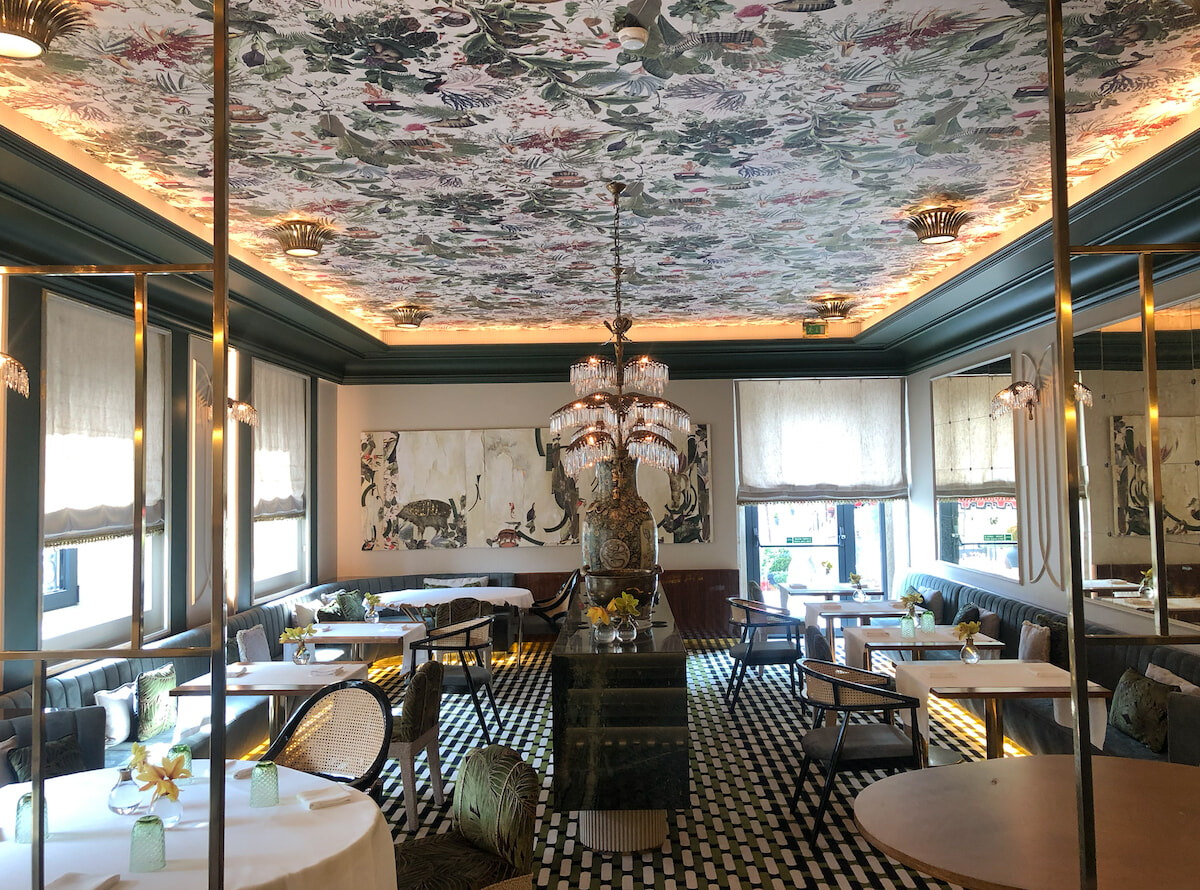 ファインダイニング、ヴィーニャでは、緑と白を基調としたラグジュアリー空間が広がる。