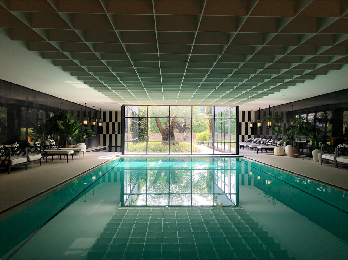 中庭から自然光が差し込む、スタイリッシュな温水プール。