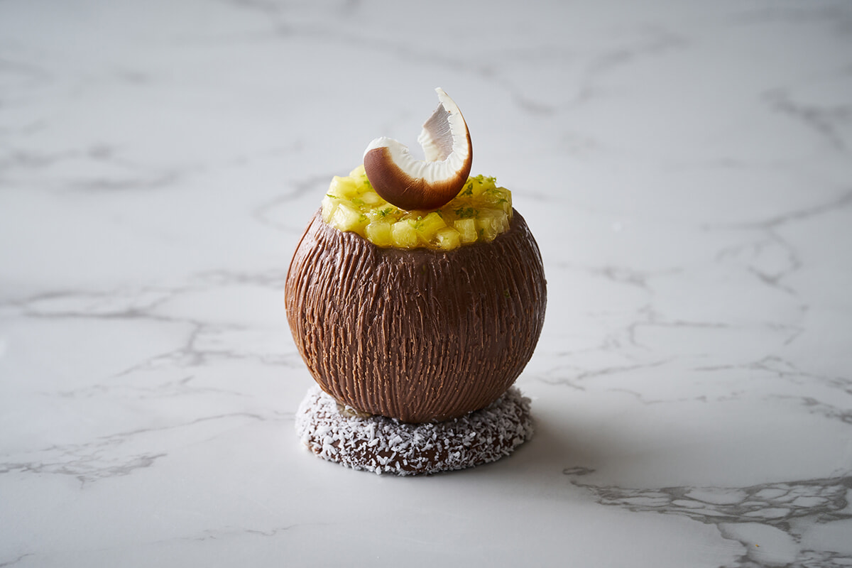 印象的だったのは、ライムココナッツっていう、全体的にココナッツの見た目なんだけど、中に生姜で風味付けしたライムのクリームとパイナップルのコンフィが詰まったケーキでした。これは夏らしくて本当によかったですね。あとは、フランス人のシェフって柚子とか抹茶を結構好まれると思うんですけど、この方も柚子ショコラっていう、チョコレートに柚子を合わせたものをつくってましたね。