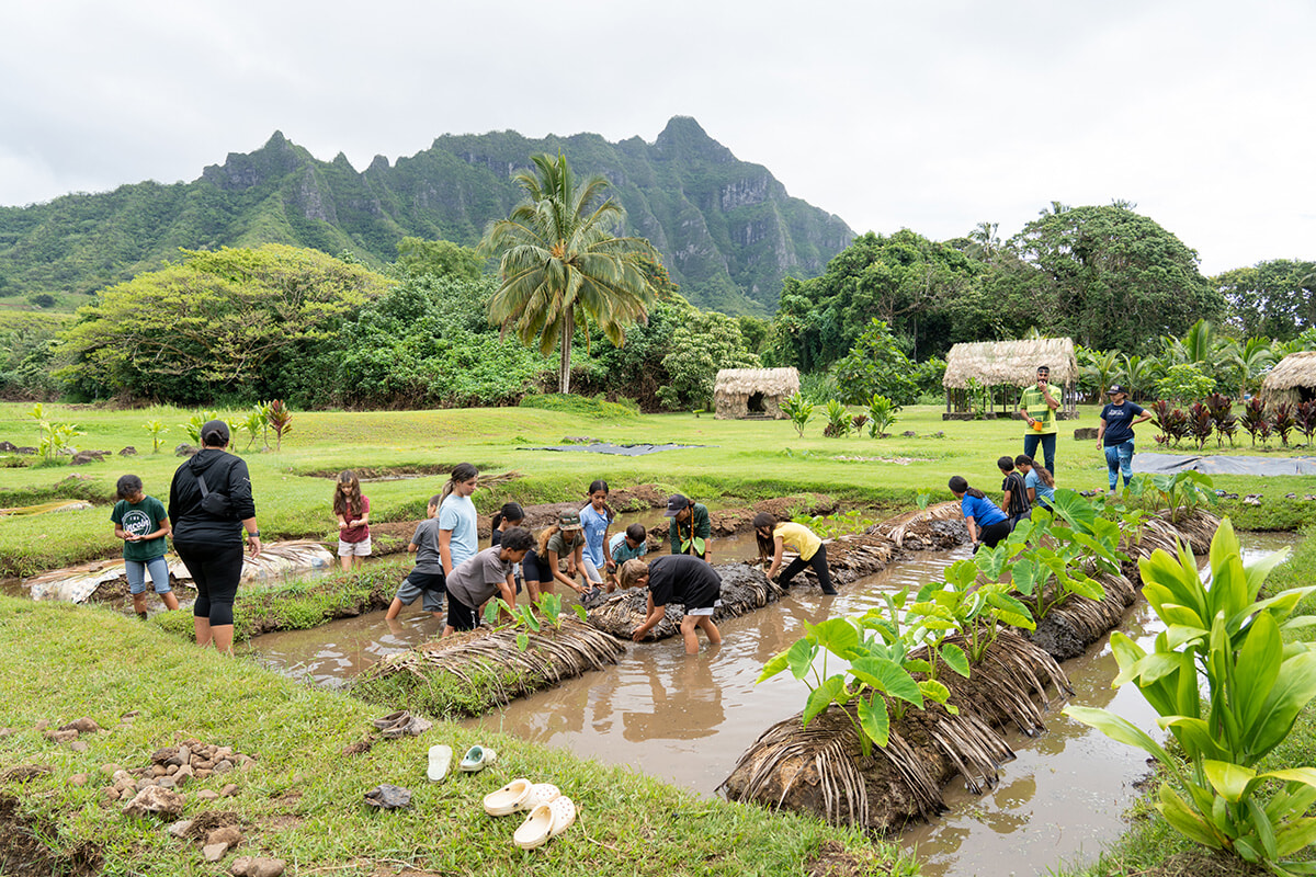 ハワイアンたちが一番大切にしている食物といえば、タロイモ以外には考えられない。古代ポリネシアの人たちが運んできたカヌープランツの一つであり、タロイモはずっとハワイアン食生活の中心にあった。ハワイの土地とタロイモの関係について知るためにカネオヘにあるクアロアランチを訪ねると、美しく広がるタロイモ畑で地元の小学生たちが農作業の体験をしていた。