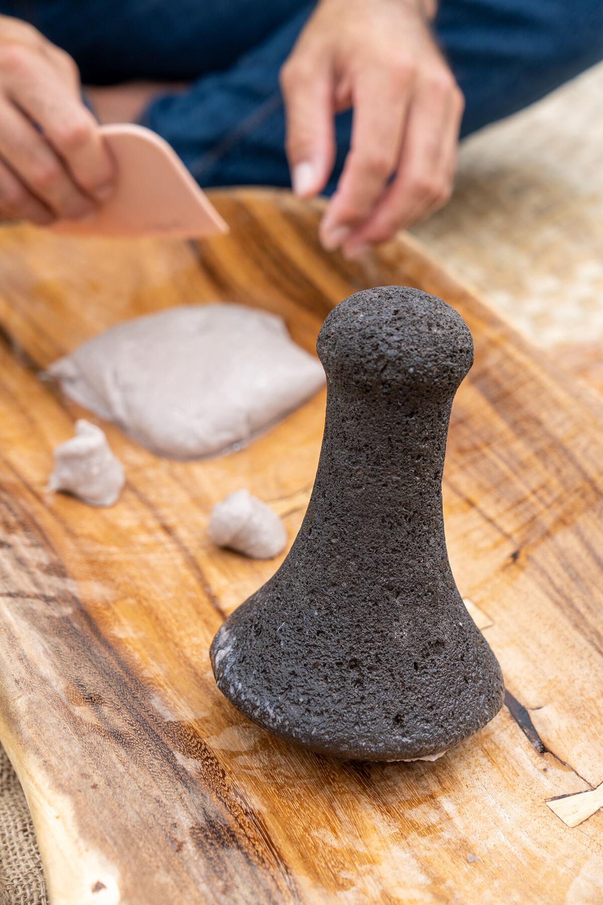 杵の役割を持つ石がポハク。パパクイアイというウッドボードの上で蒸したタロイモを餅つきのようについていく。