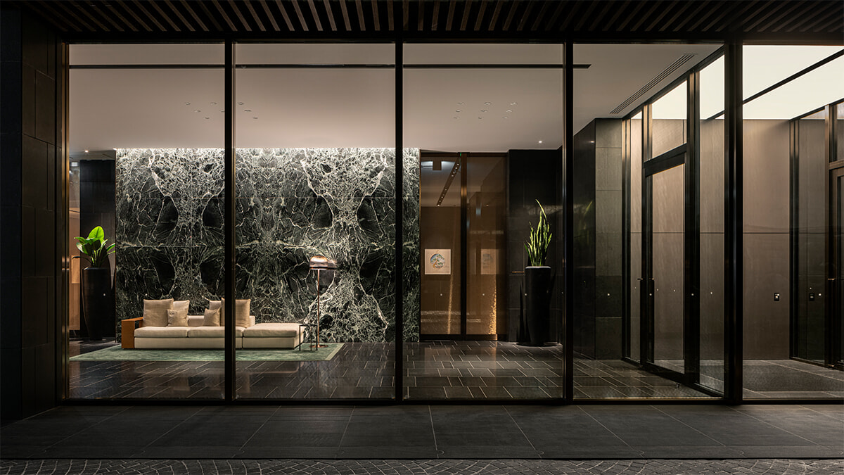超高層ビル「東京ミッドタウン八重洲」内に展開する「ブルガリ ホテル 東京。その1階にローマの精神を宿すシンプルで高級感に満ちた静謐なエントランスがあり、東京ならではのブルガリの世界へと誘う。©️Bulgari Hotels & Resorts