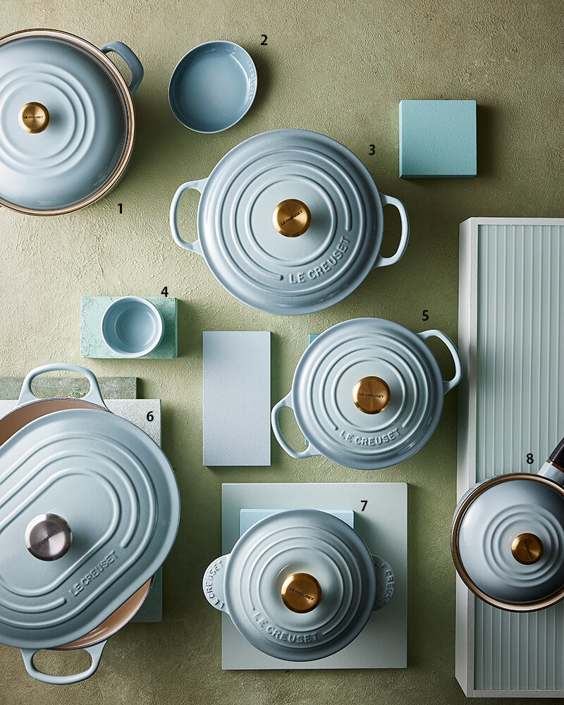 「シーソルト」コレクション、全7種9品のラインナップより。「フローラ」シリーズから、“シーソルト”カラーのうつわも組み合わせて。1. EOSキャセロール 20㎝[直径20㎝(取手込28cm)、高さ17㎝(蓋込み)、容量3.7ℓ]¥13,200 2. ミニ・フローラ・プレート(4枚入り) [横13cm、縦12cm]¥7,700 3. シグニチャー ココット・ロンド 22㎝[直径22㎝(取手込30㎝)、高さ10㎝(蓋込15㎝)、容量3.3ℓ]¥40,700 4. ミニ・フローラ・ボール(4個入り) [直径8cm、高さ5cm、容量130㎖]¥7,700 5. シグニチャー ココット・ロンド 18㎝[直径18㎝(取手込25㎝)、高さ8㎝(蓋込13㎝)、容量1.8ℓ]¥31,900 6. シグニチャー オブロング・マルミット 31㎝[幅31cm(取手込40cm)、奥行き25cm、高さ7㎝(蓋込14㎝)、容量3.4ℓ]¥41,800 7. ココット・エブリィ 18 [直径17cm(取手込23cm) 、高さ13cm(蓋込18cm)、容量2ℓ]¥28,600 8. EOS ソースパン 14cm[直径14㎝(取手込33㎝)、高さ13cm(蓋込み)、容量1.5ℓ]¥9,350/以上ル・クルーゼ(ル・クルーゼ ジャポン)
