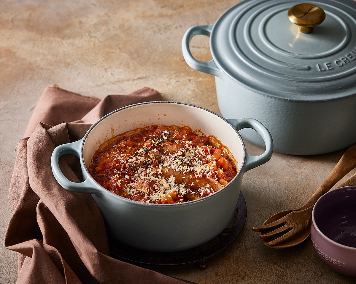 浅い楕円形のシグニチャー オブロング・マルミットは、底面が丸みを帯びていて、料理を混ぜたりすくったりしやすいのが特徴。シックな「シーソルト」カラーとシルバーの蓋のつまみの組み合わせは、より一層落ち着いたニュアンスをテーブルにもたらしてくれる。