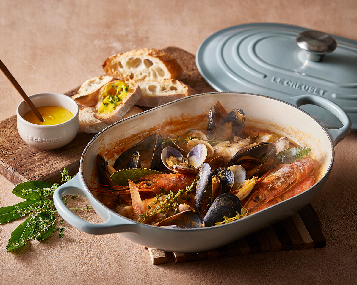 シグニチャー オブロング・マルミットを使った、南仏の名物料理ブイヤベース。オーバル状の幅広鍋だから、エビやムール貝など大きな具材がよく映える。手前から、シグニチャー オブロング・マルミット31㎝[直径31㎝(取手込40㎝)、高さ7㎝(蓋込14㎝)、容量3.4ℓ]¥41,800(オンライン限定販売) ナツメグのミニ・フローラ・ボール(4個入り) [直径8cm、高さ5cm、容量130㎖]¥7,700/ともにル・クルーゼ(ル・クルーゼ ジャポン)