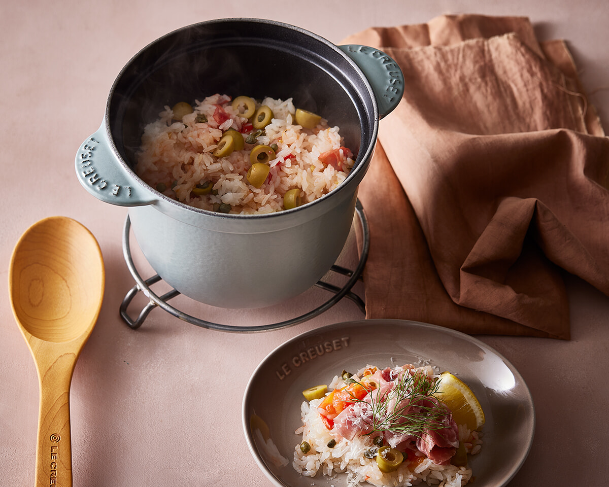 ココット・エブリィを使った、オリーブとケッパーをアクセントにした洋風混ぜご飯。仕上げに生ハムとトマトを散らせば、鍋の色味となじんで食卓が華やかに。左から、ココット・エブリィ 18 [直径17cm(取手込23cm) 、高さ13cm(蓋込18cm)、容量2ℓ]¥28,600 ナツメグのフローラ・プレート19㎝ ¥3,080/ともにル・クルーゼ(ル・クルーゼ ジャポン)