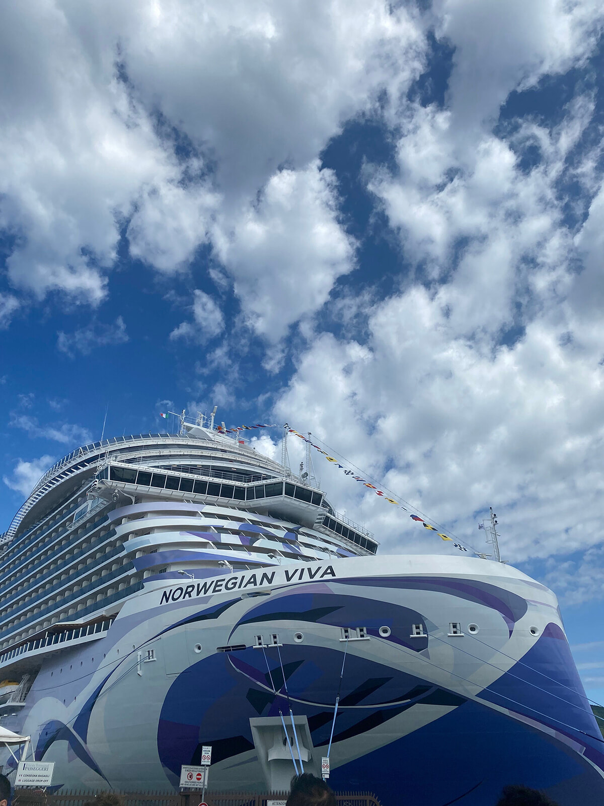 この小さな町に寄港中の「ノルウェージャン ビバ」はひと際目を惹く。それもそのはず、「ノルウェージャン ビバ」は3099人も乗船できる、クルーズ船の中でも大型規模なのだ。