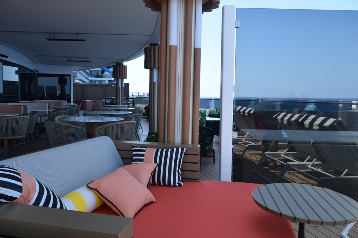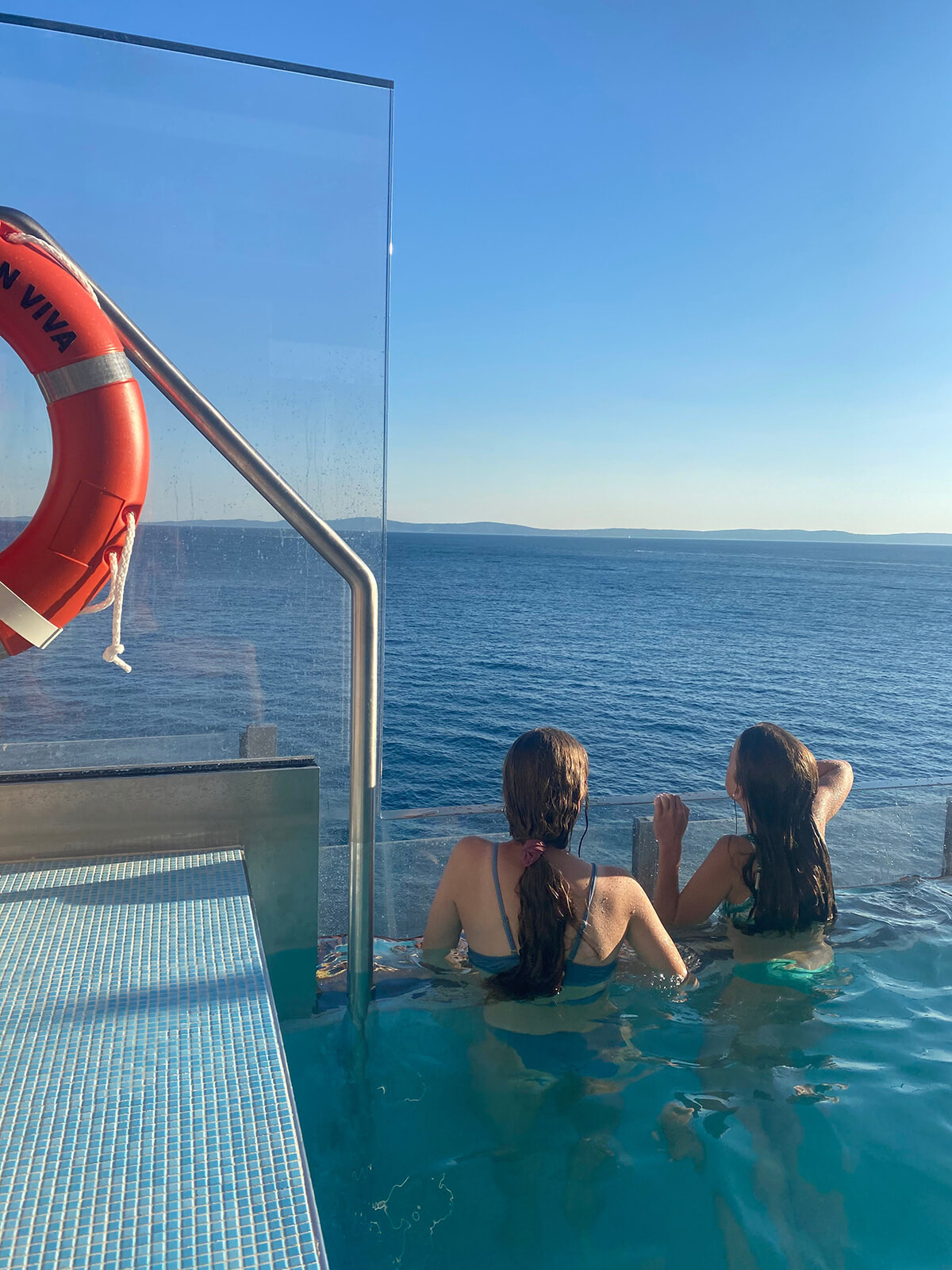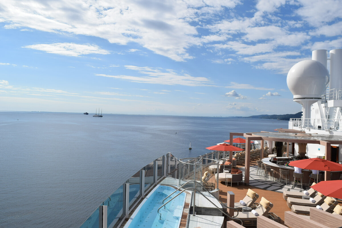 陽光が燦々と降り注ぐ天気の良い日には、8階インフィニティプールや17階プールデッキでのんびりと過ごしたい。寄港中は港から美しい街並みを眺めながら、運航中はどこまでも青く広がる海を眺めて。読書したり、昼寝したり、思い思いに至福のひとときを堪能できる。インフィニティプールでは、船の上で海と一体感になるような不思議な感覚を味わって。