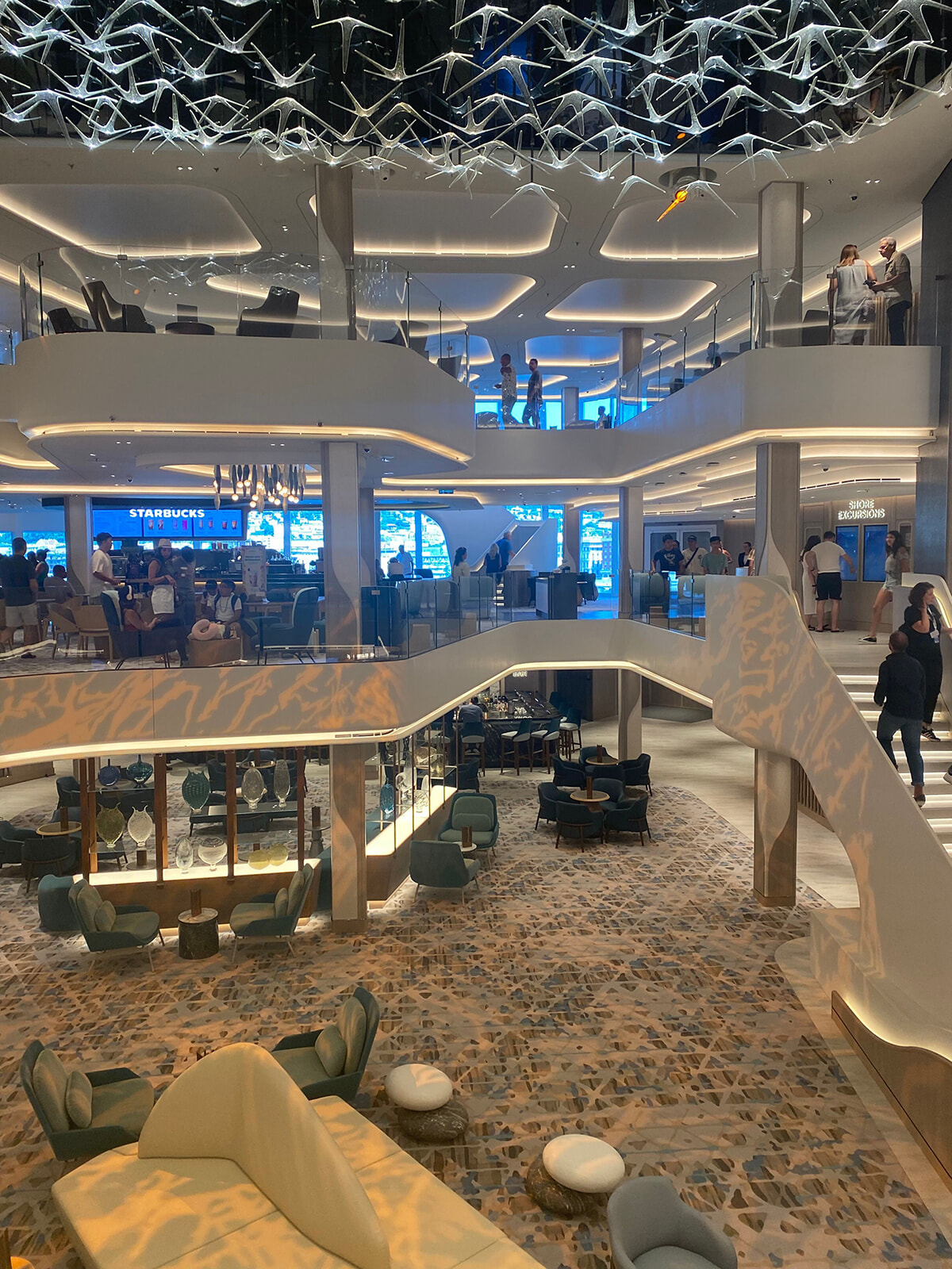 7階から9階まで吹き抜けになったラグジュアリーなロビーは圧巻。ロビーには、スターバックスやバーが並ぶ。