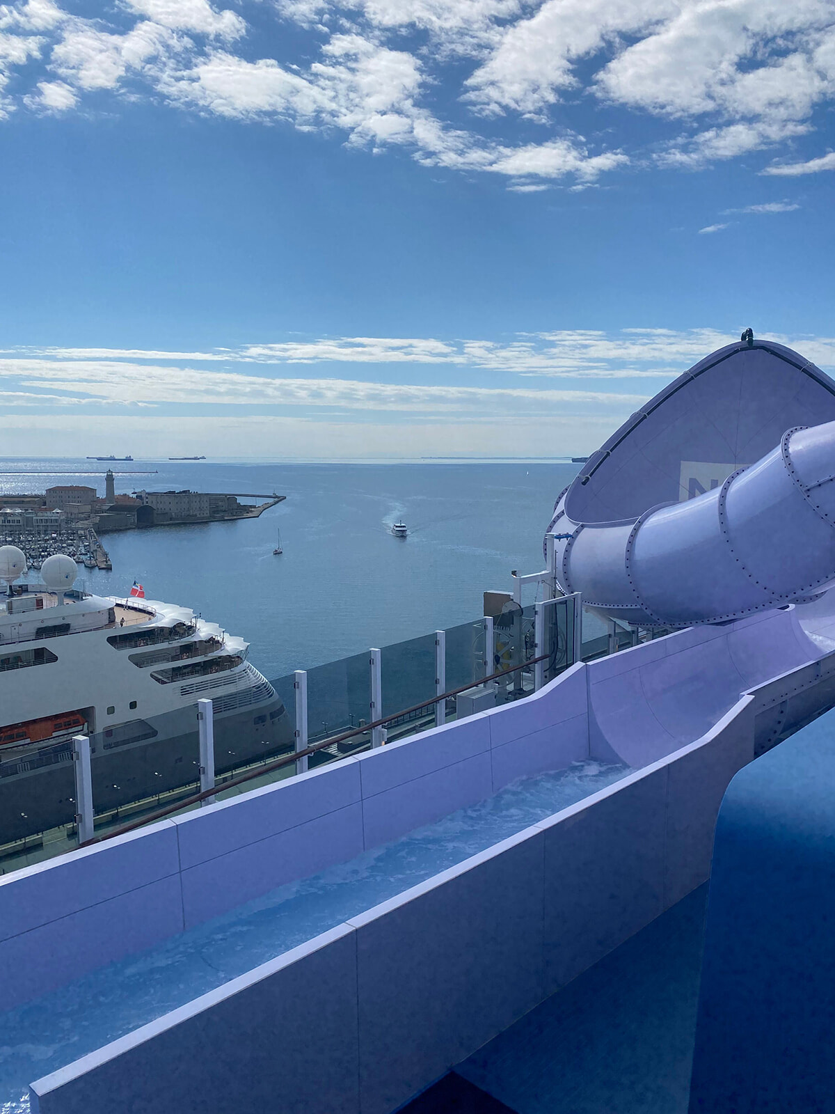船の上層階に設置されたウォータースライダーは、海に向かって滑り降りるようなスリリングな体験に。