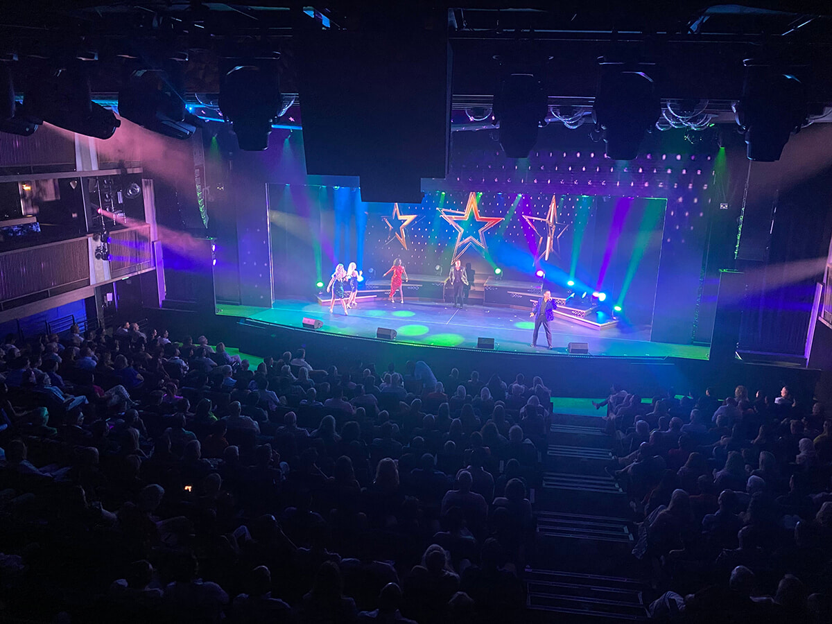 本場の劇場差ながらの大きなシアタールーム。クルーズ前半スケジュールでは、シンガーたちがレディ・ガガやセリーヌ・ディオンの曲を歌って会場を盛り上げた。