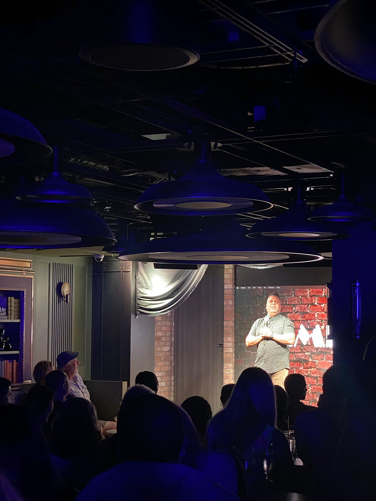 船上のあちこちで同時にさまざまなイベントが開催されている。アメリカのコメディアンによる漫才も人気。