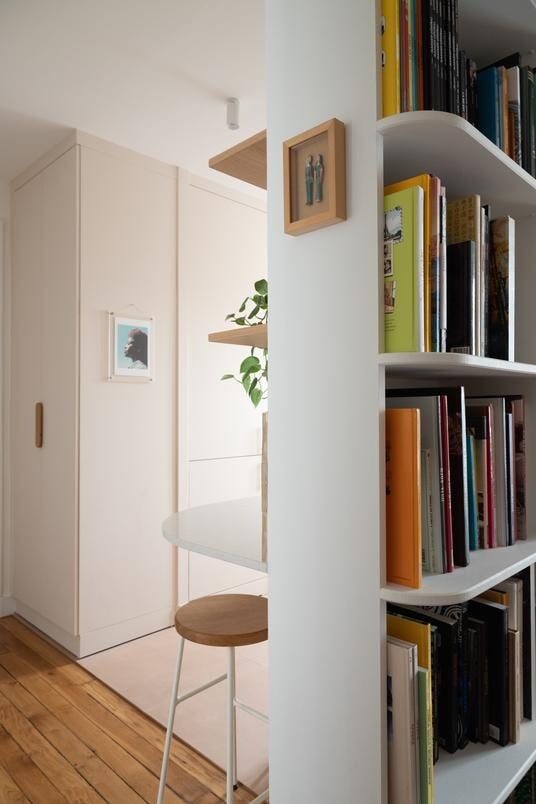 アフター:作り付けの本棚のある玄関。オープンキッチンに直接アクセスできる。photography: Stanislas Gros