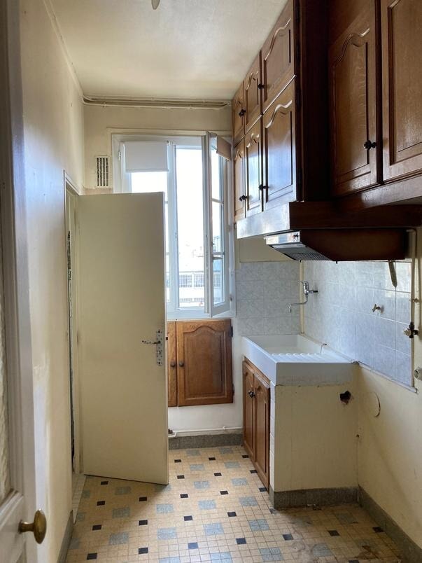 ビフォー:狭くて古めかしいキッチン。トイレの扉がかなり目立つ。photography: Studio Castille