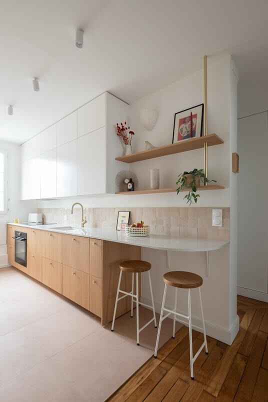 「50年代以降おそらく一度も改装されていない、年季の入った暗い60平方mを家族用の明るいアパルトマンに改装することが私たちの使命でした。すでに子どもが1人いて、2人目の出産を控えたカップルのために、寝室はふたつ必要でした。寝室はもともとふたつあったので、手を入れた間取りは、主には玄関と浴室です。玄関とリビングを仕切る壁は、取り壊しのできない耐力壁でした。床板は良好な状態だったので残し、古臭いタイルを取り除きました。空間全体を明るくするために、色は白を基調にしましたが、無機質な印象にならないよう、ピンクベージュ系のパレットと、パステル系のアクセントをプラスしました。全体的にとても温かみのある空間になりました。トイレだけには、色へのこだわりを発揮しています!」