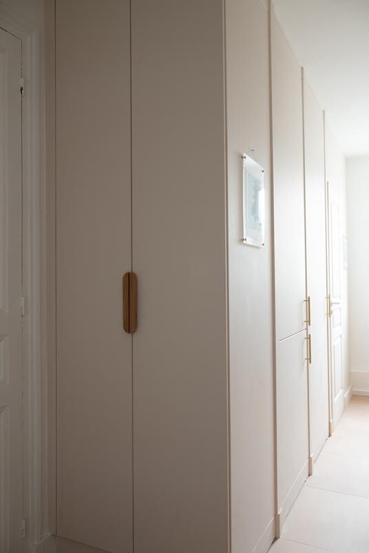 アフター:空間にとけこむ長さ2m50のクローゼットで、収納力のある安らぎの寝室を実現。photography: Stanislas Gros