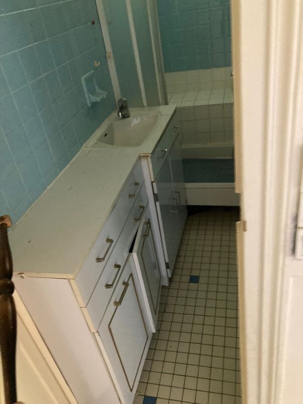 「家族みんなで使える浴室を設けることは、絶対に譲れない一点でした。玄関扉の正面、納戸があった場所に浴室を設置することにしました。スペースを広げるために、扉の位置を少し前に出し、隣の部屋との間仕切り壁もずらしました。浴室はシャワー付き浴槽と、大きな洗面ボウルと鏡がある洗面台のふたつの部分からなります。いつものように、”鏡コーナー”が扉の正面に来るようにレイアウトしました。浴室の扉を開けたとき、浴槽が正面にあるより、洗面台が見えるほうが快適だからです」