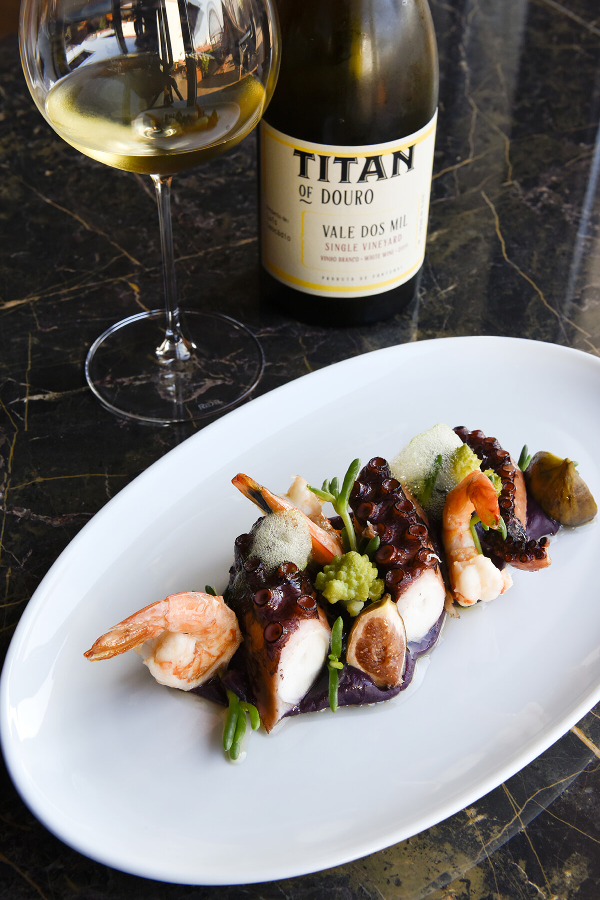 タコ、エビ、シーアスパラガス、イチジクのグリルとサツマイモのピュレ、コリアンダーの泡添え「Braised Octopus, Sweet Potato, Roasted Figs, Prawns, Sea Asparagus and Coriander Foam」39ユーロ。樽で発酵熟成したフレッシュながらタンニンも感じられる白ワイン「Titan of Douro, Vale dos Mil」ボトル90ユーロ