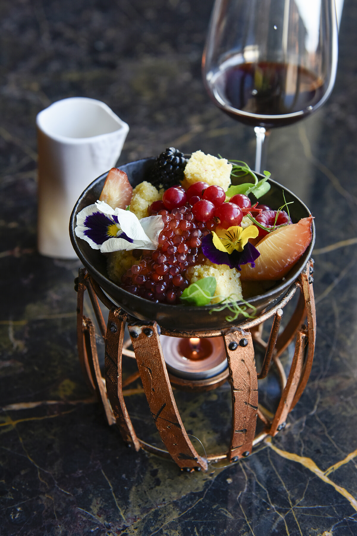 赤ワインを用いたリダクションがけトウモロコシのパウンドケーキ、レッドベリーとスモモなどのフルーツ添え「Touriga National Barrel and Its Notes:Plum and Cassis」16ユーロ