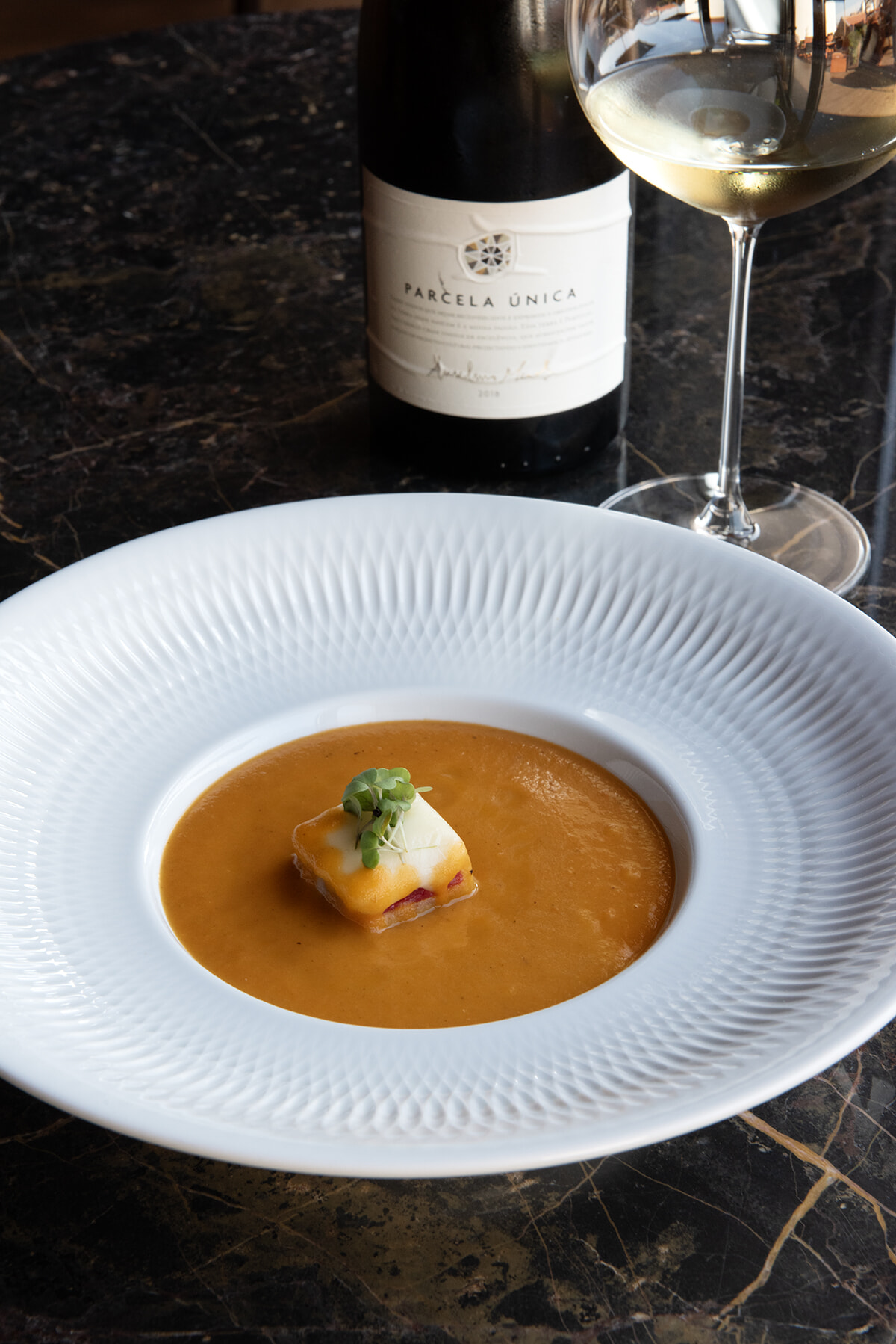 チョリソー、スモーク豚、ハムを挟んだミニフランセジーニャ、ローストトマトを用いたトマトスープ「Creamy Tomato Coracão de Boi Red Oxheart with Francesinha」12ユーロ、酸味の利いた白ワイン「Anselmo Mendes, Parcela Única」ボトル75ユーロ