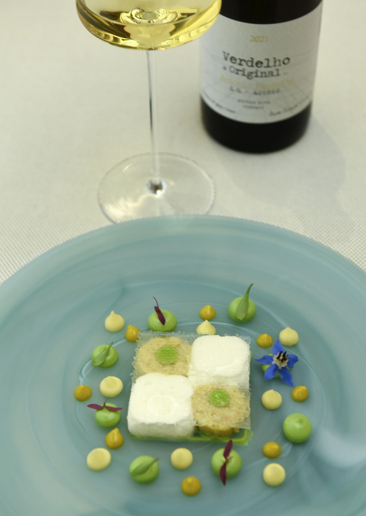 写真の料理はすべて14品のコース「14stops around Portugal」(140ユーロ)から。ワインペアリングは7種類のコース「Wine Pairing 7steps」(70ユーロ)から。カニとユズのムース「Edible Crab, Savora Mustard, Yuzu」は、アボカド、シトラス、マスタードの酸味が利いたソースとともに。フレッシュな白ワイン「Verdelho Original」