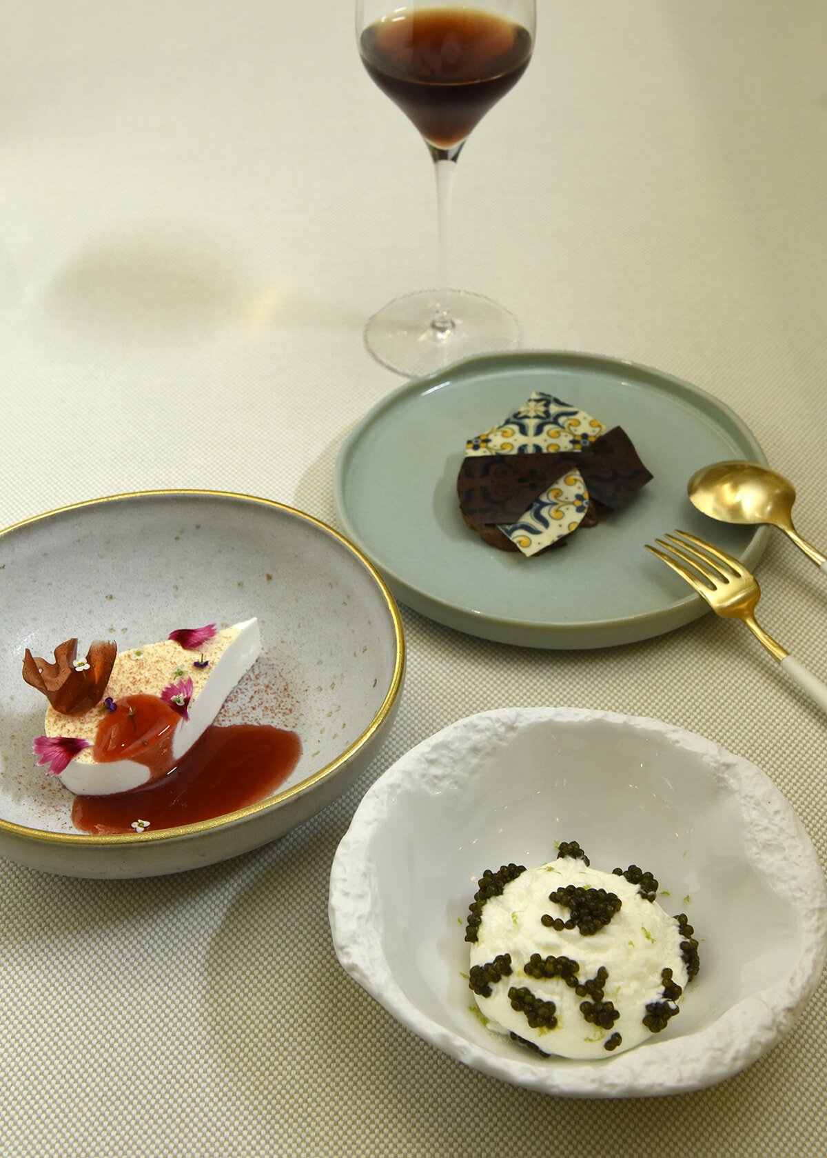 ポートワイン「Vintage Porto Quinta do Cachão」。塩の花を用いたアズレージョ柄の2種のチョコレートとムース「Chocolate from Brazil」。ライムシャーベット、ジンとライムのジャムとココナッツクリームとキャビア添え「Coconut, Gin from Alentejo, Caviar」。ストロベリーソースがけメレンゲ「Organic Strawberry from Douro」