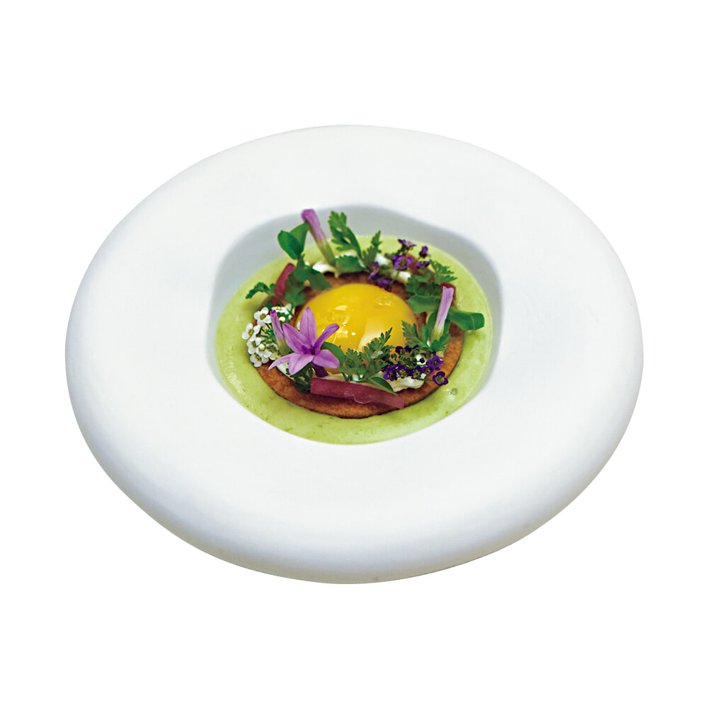 生卵のコンフィ、クルトンと赤ピクルス添え「Confit Egg Yolk, Ratte Potato, Wild Garlic」はガーリックとジャガイモ、野生のニンニクの葉の濃厚ソースと混ぜていただく。