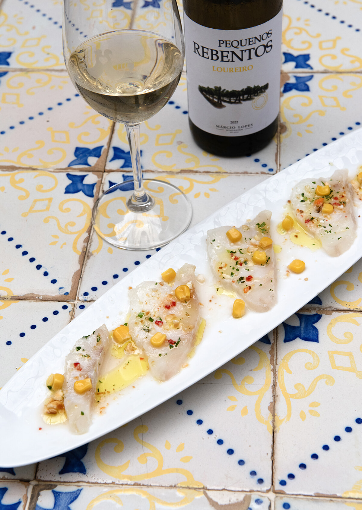 シトラスの酸味が利いた新鮮なタラのセヴィーチェ、コーン添え「Ceviche de Bacalhau」9ユーロ。ライムと唐辛子、オリーブオイルとコリアンダーの2種のソースで。フレッシュでシトラスなスパークリングワイン「Pequenos Rebentos Loureiro」グラス5ユーロ