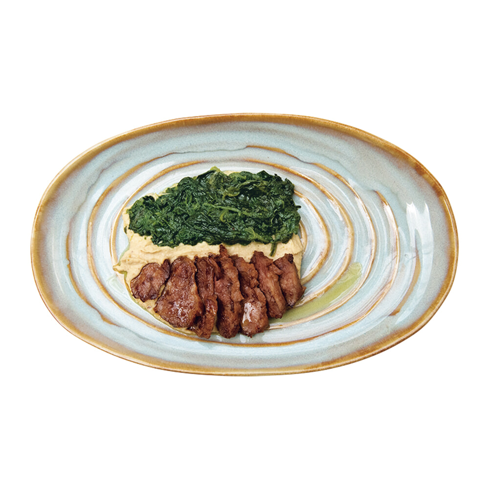 アレンテージョ地域で定番の黒豚の頬肉を白ワイン、ガーリック入りのオリーブオイルに3日間漬けて低温でグリルした「Bochecha de Porco Preto」8ユーロ。ゴマが隠し味のヒヨコ豆のフムスとホウレン草ともマッチ。