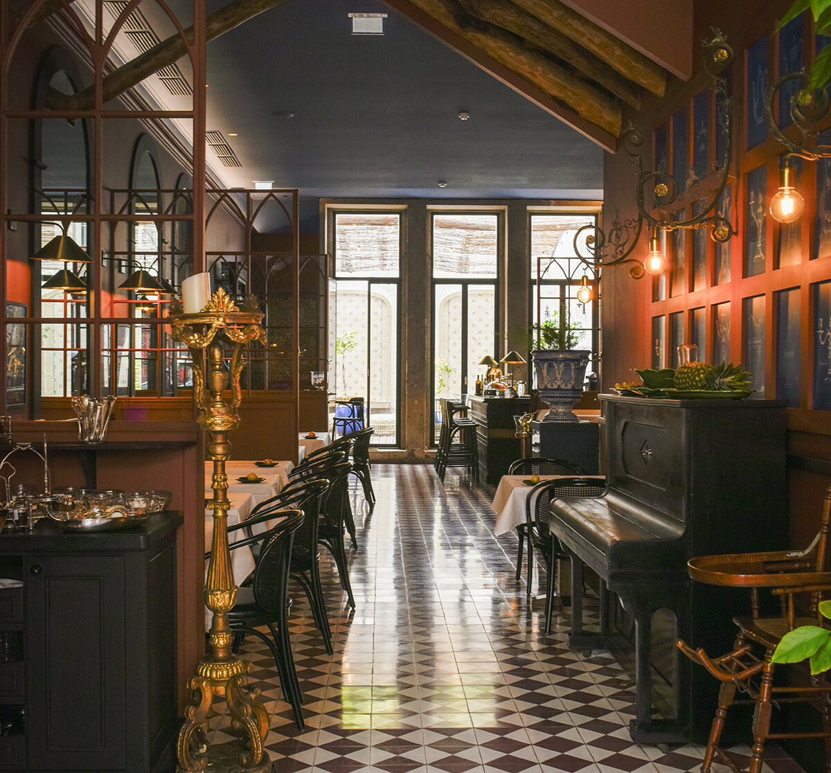 クラシックな調度品やタイルの床が落ち着いた雰囲気のダイニング。
