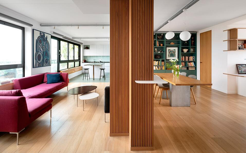アフター:間仕切りが取り払われた、広々とした空間。バルコニーに面したリビングとキッチン。photography: Gabrielle Voinot
