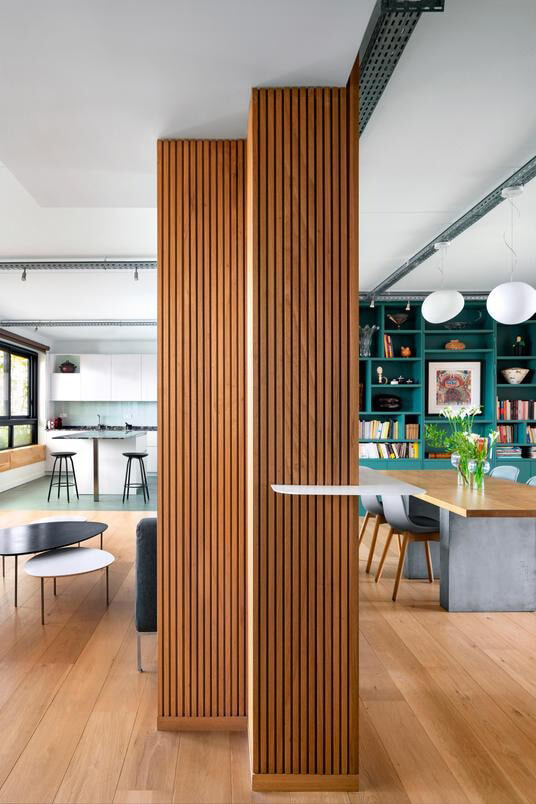 アフター:木製のカバーで覆い、棚板を取り付けた。太い柱が玄関カウンターに変身。photography: Gabrielle Voinot